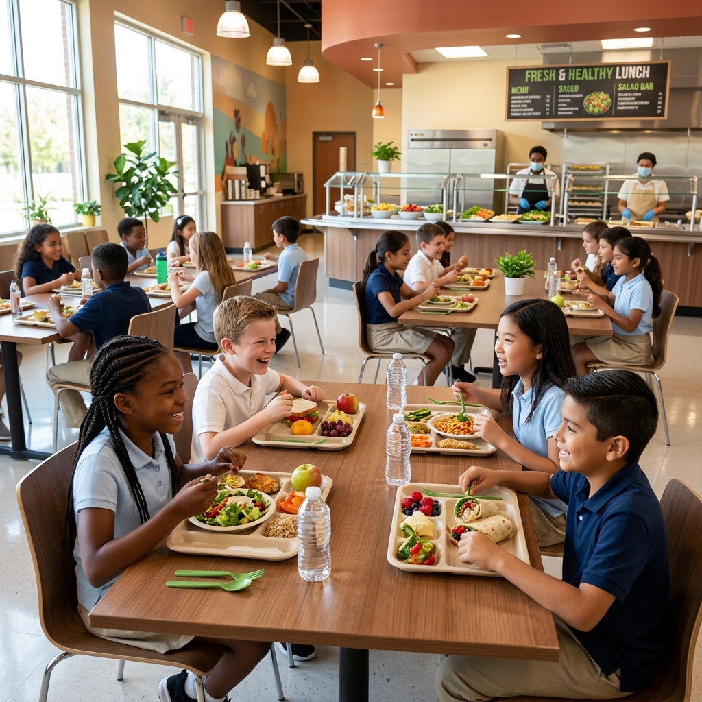 Clean and supervised dining spaces where children are encouraged to practice healthy eating habits.